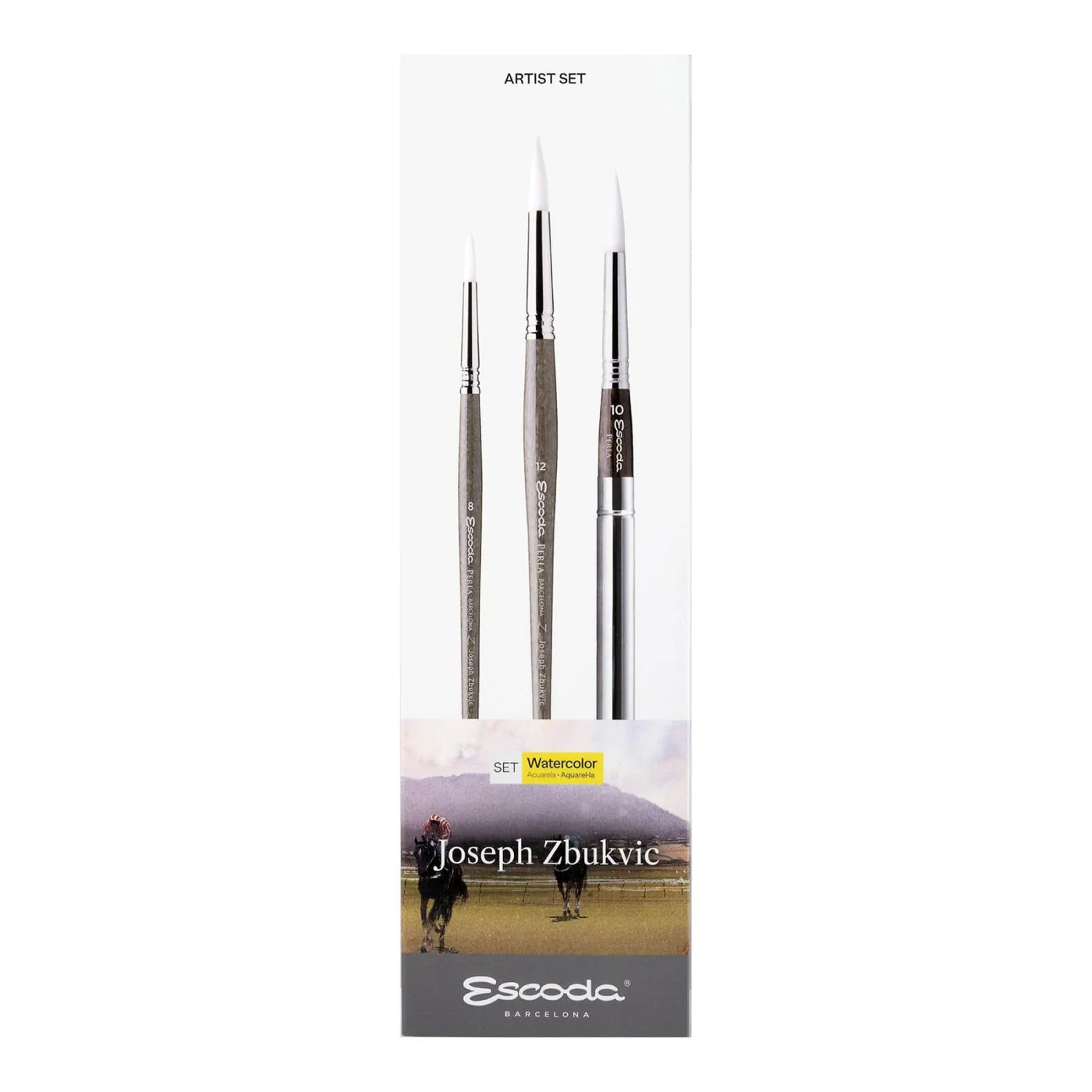 Este set está diseñado en colaboración con el reconocido acuarelista Joseph Zbukvic. Incluye tres pinceles sintéticos de alta calidad, especialmente seleccionados para satisfacer las necesidades de los artistas de acuarela. Los pinceles Escoda están fabricados con fibras sintéticas que imitan el comportamiento del pelo natural, ofreciendo una excelente capacidad de retención de agua y precisión en la aplicación del color. Este set es ideal para técnicas detalladas y efectos de lavado en acuarela.
